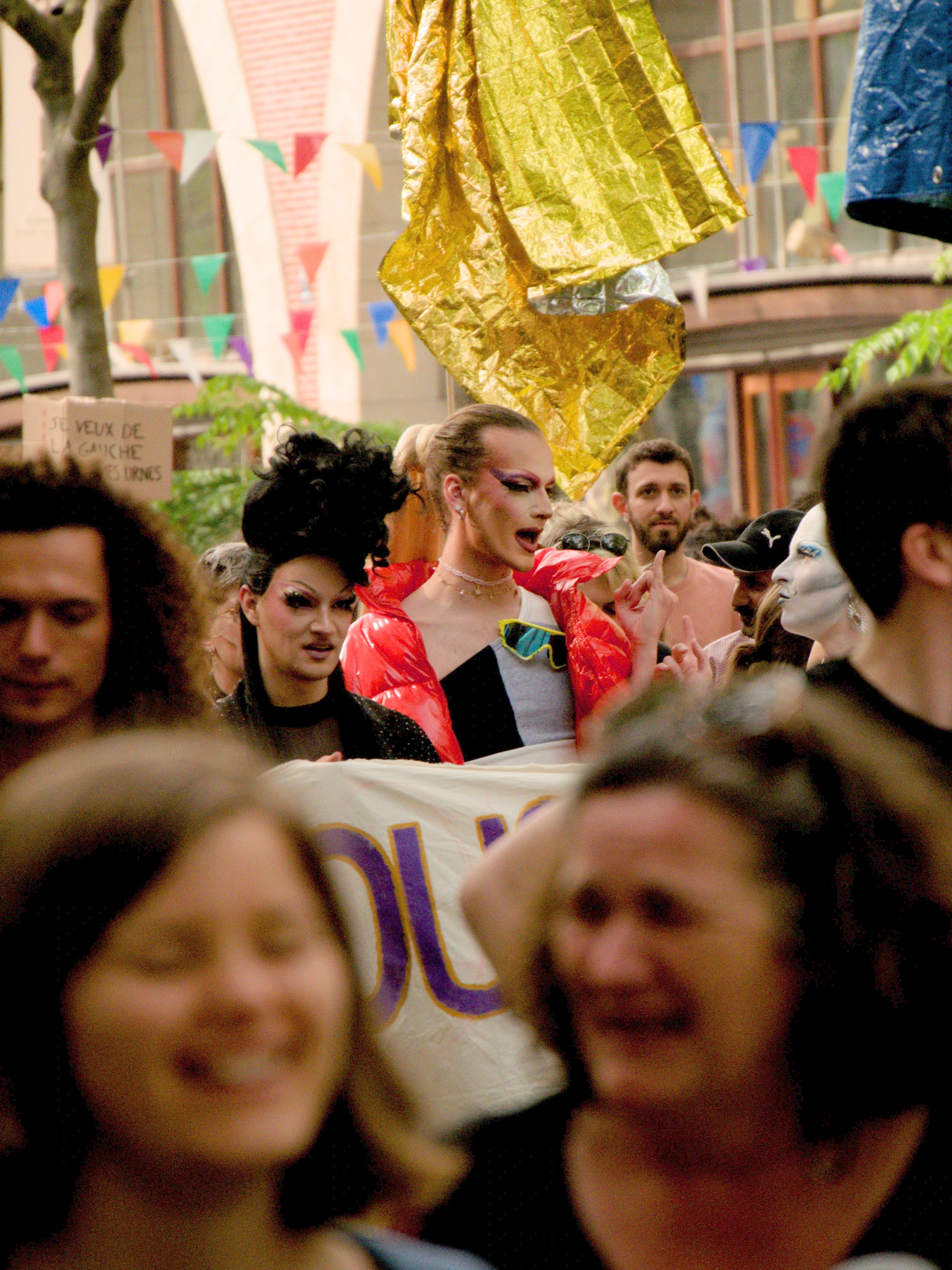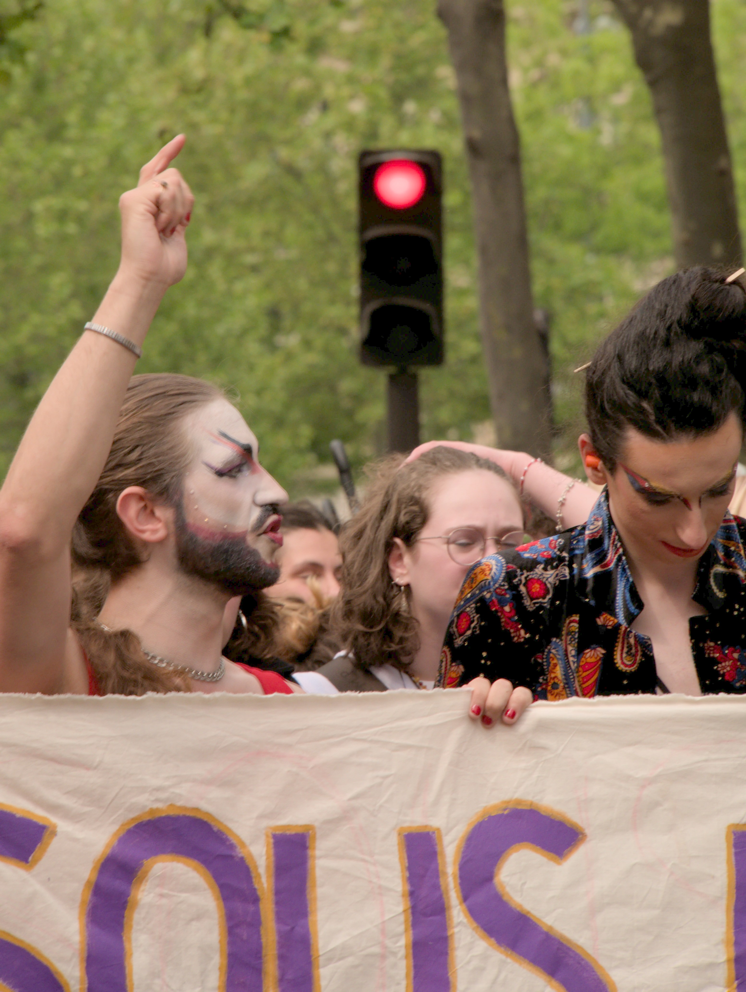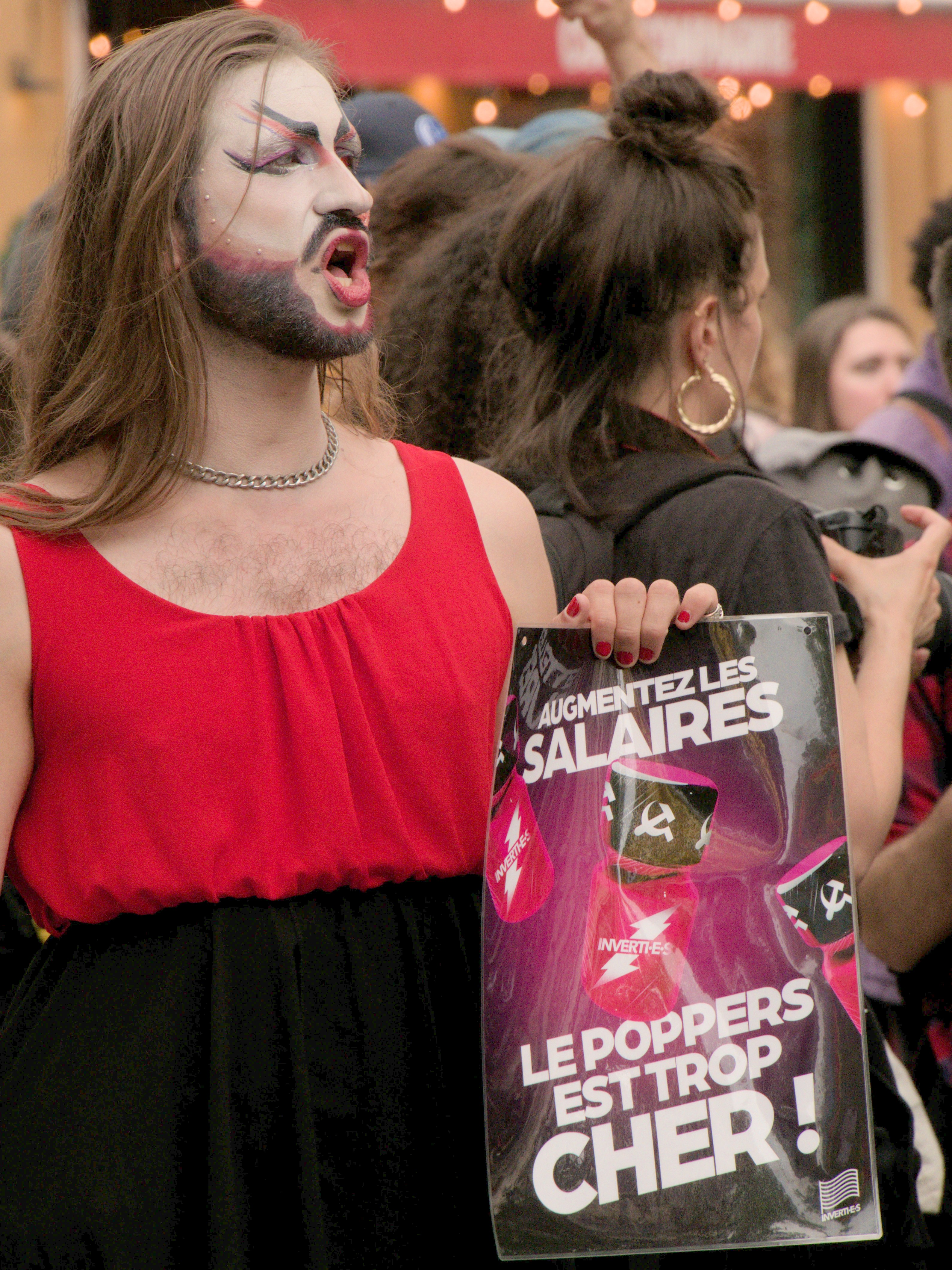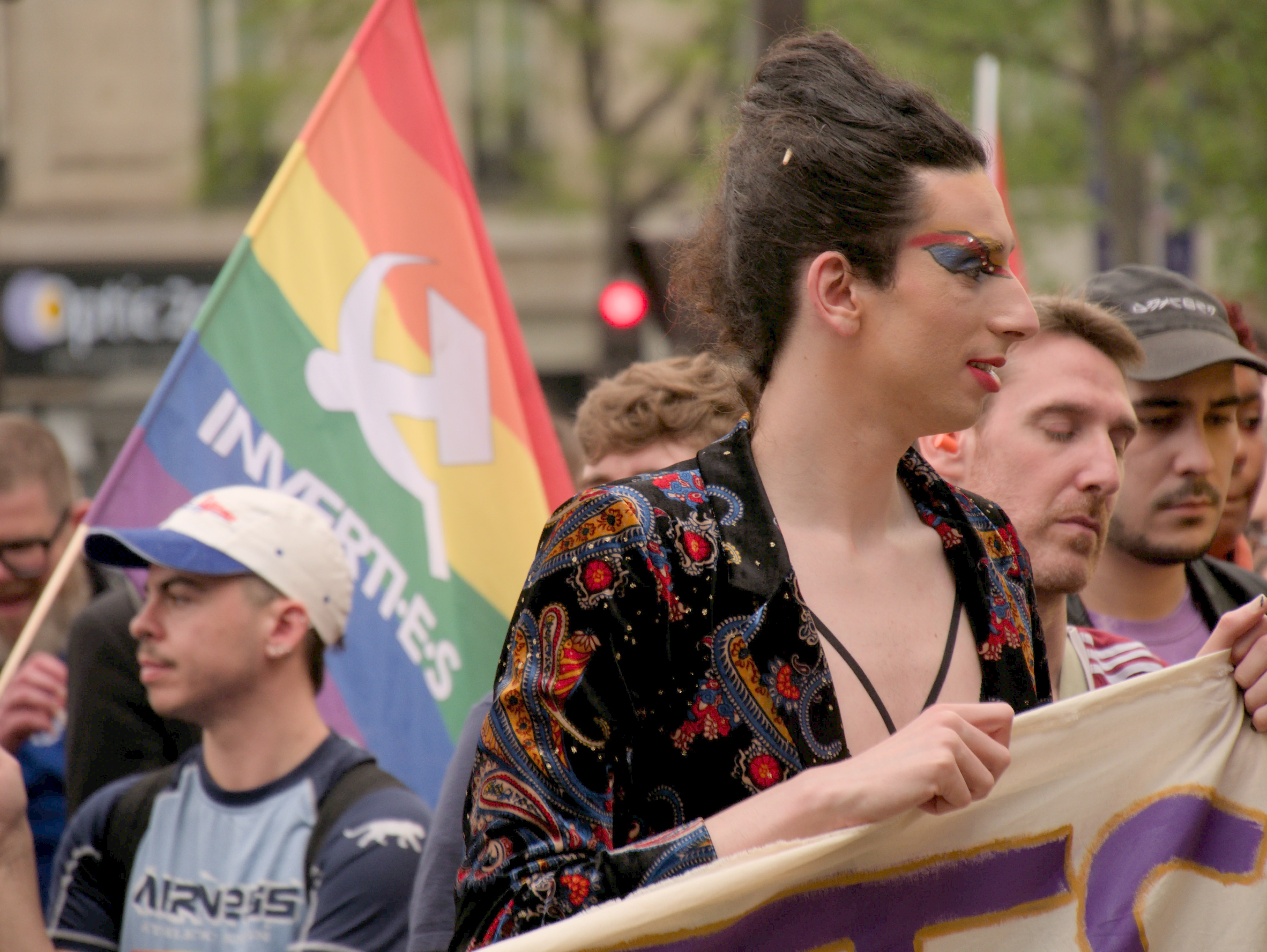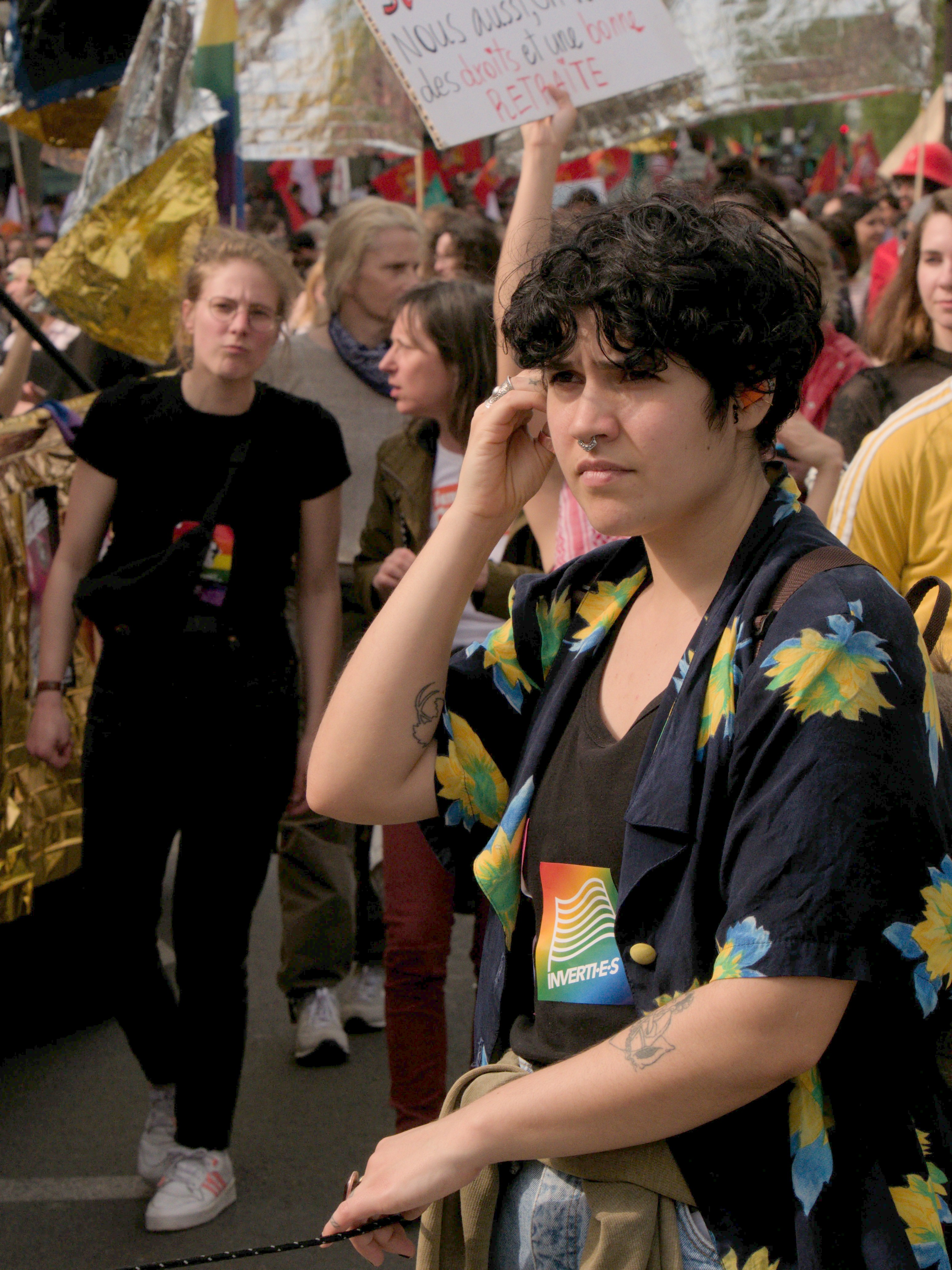 Cette année, pour le Premier Mai, fête nationale des travailleurs et travailleuses, j’ai décidé de suivre avec mon appareil photo le cortège des Inverti·es, un collectif politique qui s’efforce à mettre en lien les enjeux de luttes des classes économiques avec ceux que subissent les minorités sexuelles regroupés sous le sigle LGBTI. Le collectif était accompagné par des Drags venues défendre la valeur de leur travail et revendiquer une rémunération adéquate.